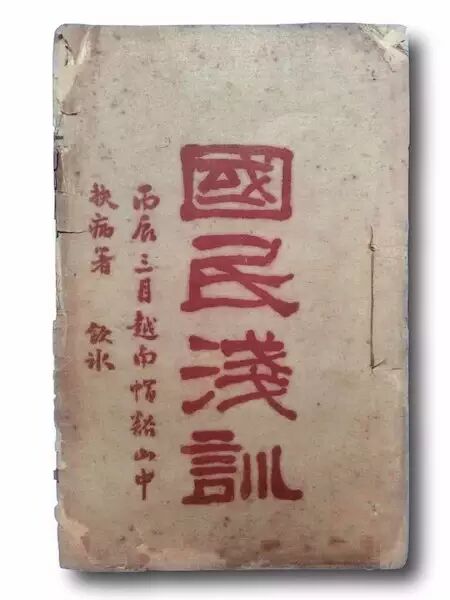 實際上,該書的封面已不同尋常。在梁啟超自題的“國民淺訓”四個端莊凝重、帶有漢魏碑體風格的紅色大字後,又有行書小字: